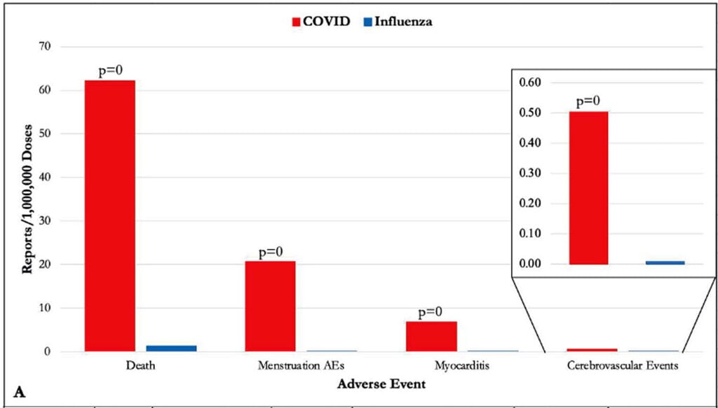 Hanno anche riscontrato una maggiore incidenza di problemi mestruali, miocardite ed eventi cerebrovascolari dopo la vaccinazione COVID-19 rispetto alla vaccinazione antinfluenzale, come mostrato nella figura 1A: