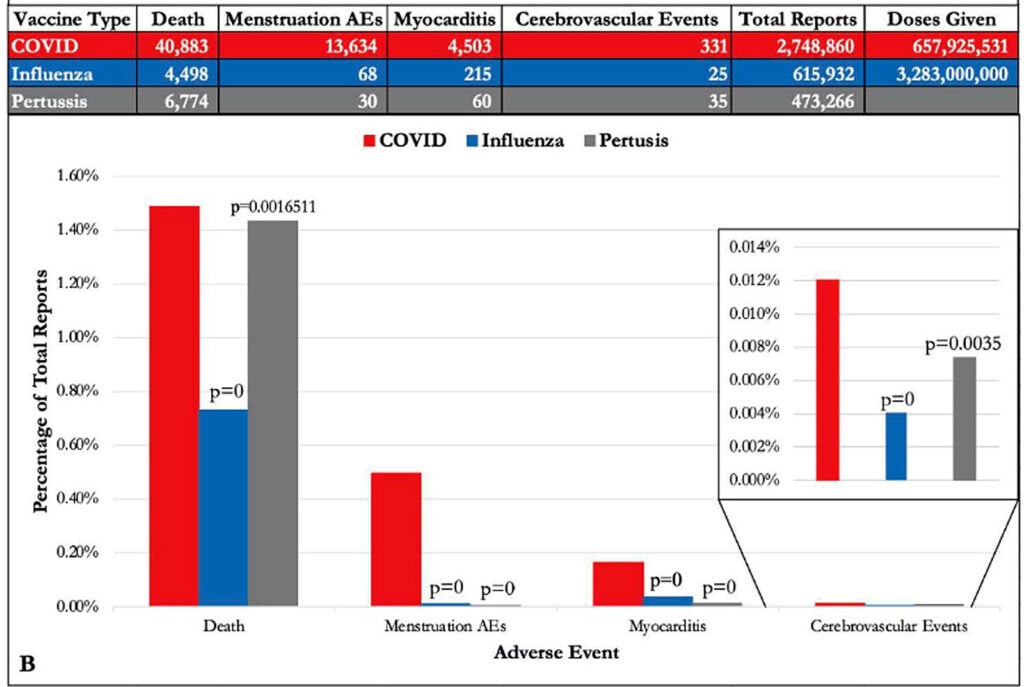 I ricercatori hanno anche confrontato gli eventi avversi riportati nel VAERS a seguito dei vaccini COVID-19 con gli eventi avversi riportati a seguito dei vaccini contro l’influenza e la pertosse.