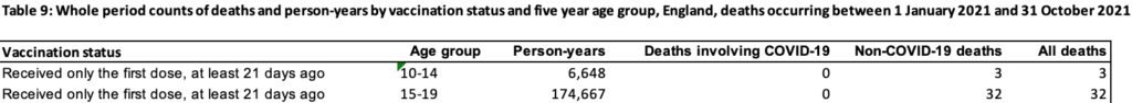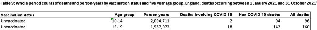Come notato dal sito Daily Exposé, una tabella separata che delinea «decessi e anni persona per stato di vaccinazione» include gruppi di età di 5 anni dai 10 anni in su. Dai dati forniti è possibile calcolare il tasso di mortalità per 100.000 anni persona.