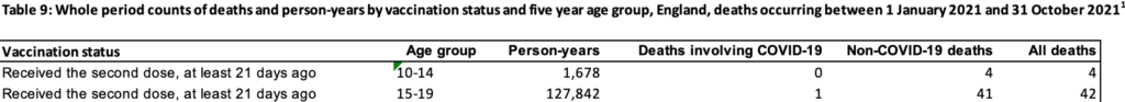 Tra coloro che hanno ricevuto due dosi di vaccino COVID in entrambi i gruppi di età giovane, i tassi di mortalità erano ancora più alti, con 32,9 decessi ogni 100.000 anni persona nella fascia di età 15-19 e uno sbalorditivo 238,4 decessi ogni 100.000 anni persona tra 10 – 14enni nel Regno Unito.