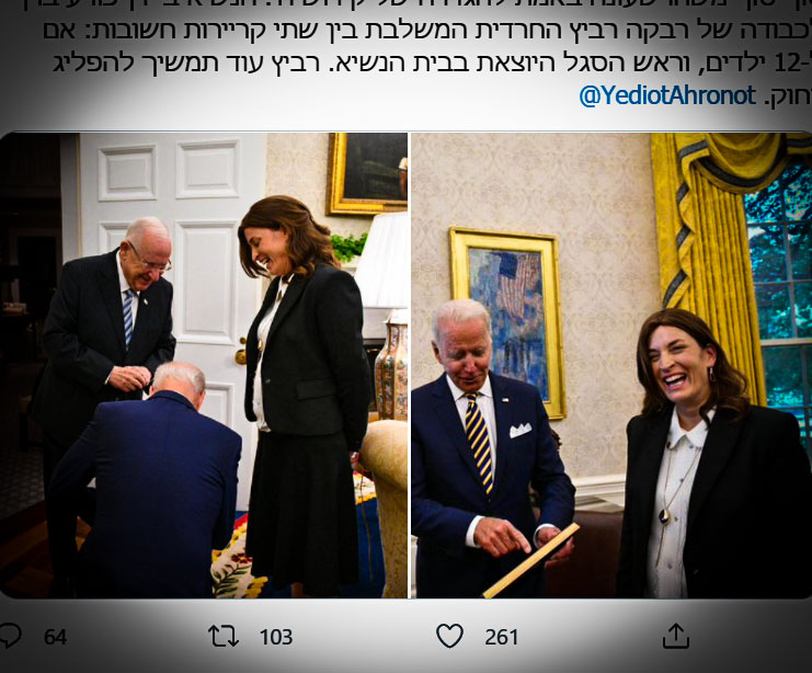 סוף סוף משהו שעונה באמת להגדרה של קידוש ה׳. הנשיא ביידן כורע ברך לכבודה של רבקה רביץ החרדית המשלבת בין שתי קריירות חשובות: אם ל-12 ילדים, וראש הסגל היוצאת בבית הנשיא. רביץ עוד תמשיך להפליג רחוק. @YediotAhronot pic.twitter.com/YHjrwPVuNl