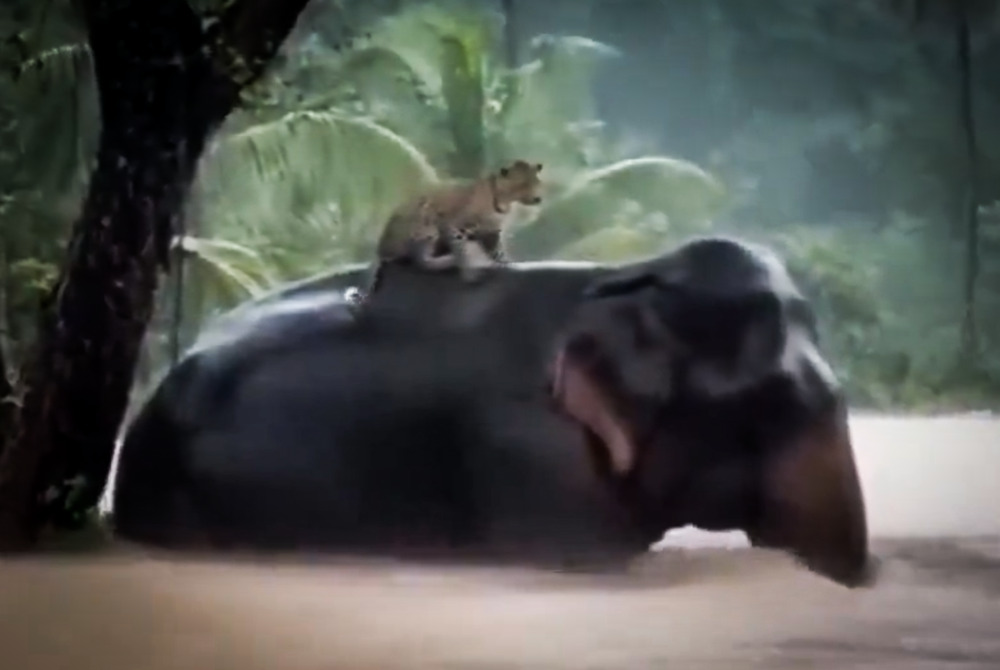 💔 This breaks my heart into a thousand pieces. A lone elephant, the mighty king of Sri Lanka’s jungles, fighting for his life in chest-deep muddy water… while a terrified leopard clings to his back, both of them running from a flood that shows no mercy. Two souls who would… pic.twitter.com/EDxyu2VLnS