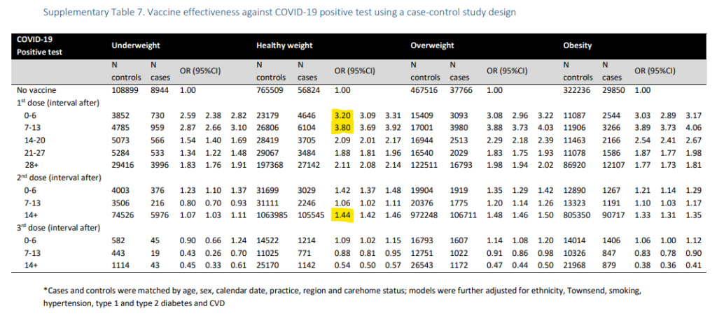 Leggendo quanto evidenziato in giallo nella tabella superiore, parrebbe proprio che le persone avevano da tre a quattro volte più probabilità di risultare positive al COVID rispetto alle loro controparti non vaccinate.