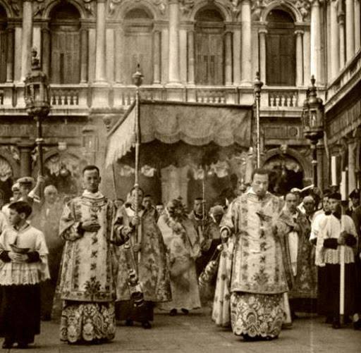 Vediamo le Processioni del Corpus Domini, dove Cristo veniva esposto e venerato dalle città più grandi ai paesini di montagna più piccoli, dal Papa al parroco di campagna, con i bambini e le bambine che lanciavano i petali per tutte le strade in cui veniva portato in Processione il Santissimo Sacramento.