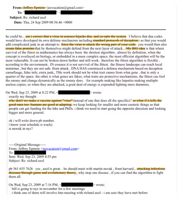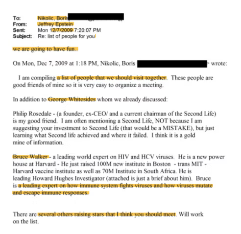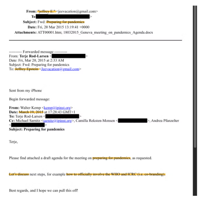 Nel 2017, un’e-mail di Boris Nikolic indirizzata sia a Epstein che a Gates (quattro anni dopo la lettera di accordo in cui Epstein avrebbe mediato la rottura tra Nikolic e Gates) menziona la «pandemia» come un’area chiave per un Donor Advised Fund.