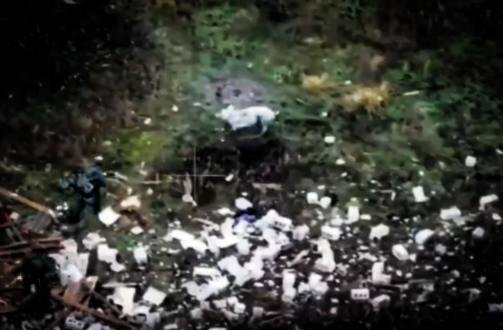 Ripreso da un drone, il video mostra due militari russi che si avvicinano a un fabbricato in rovina, con un maiale domestico nelle prossimità. Il filmato è stato caricato sabato sul canale Telegram RVvoenkor.