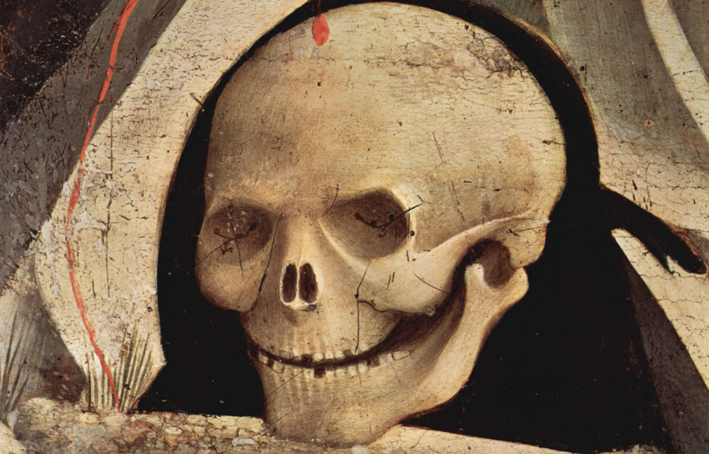 Immagine: Fra Angelico (circa 1395–1455), Cranio di Adamo sul monte Golgota, particolare di una crocifissione con San Nicola e San Francesco (1435), oratorio di San Niccolò del ceppo, Firenze.