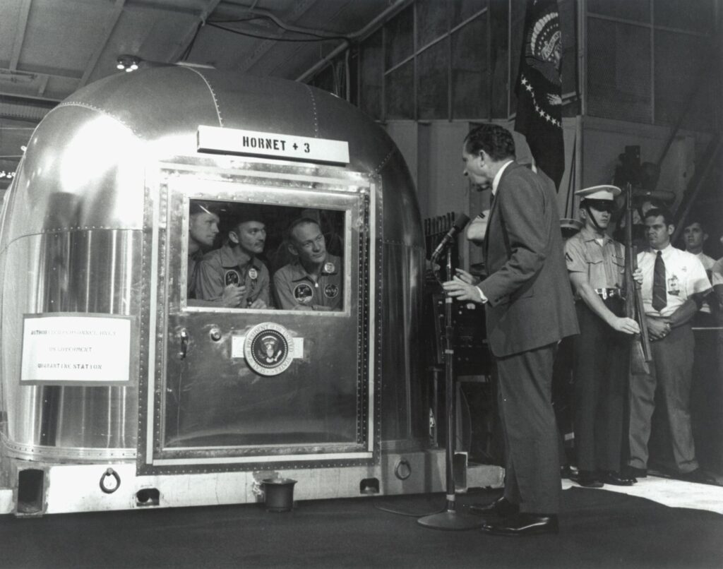 Gli astronauti dell’Apollo 11, da sinistra a destra, Neil A. Armstrong, Michael Collins ed Edwin E. Aldrin Jr., all’interno della struttura mobile di quarantena a bordo della USS Hornet, ascoltano il presidente Richard M. Nixon che dà loro il benvenuto sulla Terra. CC0 via Wikimedia