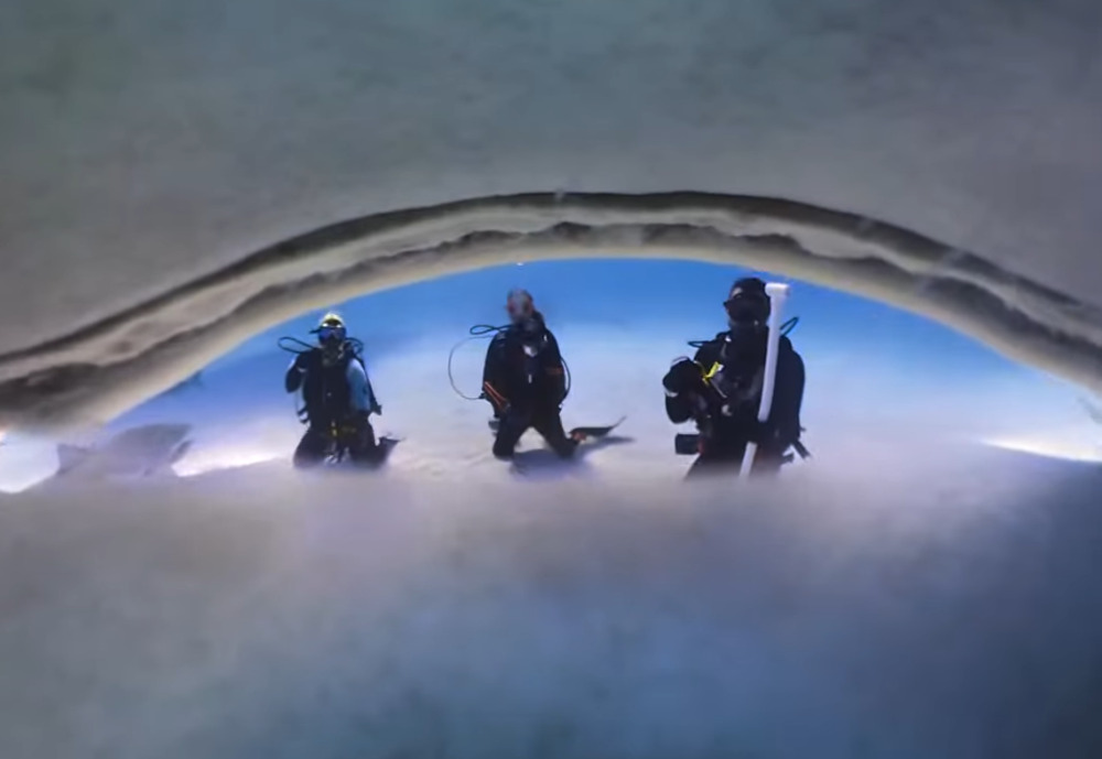 Sorprendentemente lo squalo riesce persino a catturare uno scorcio di tre subacquei vicini, immortalati dall’interno delle sue fauci.